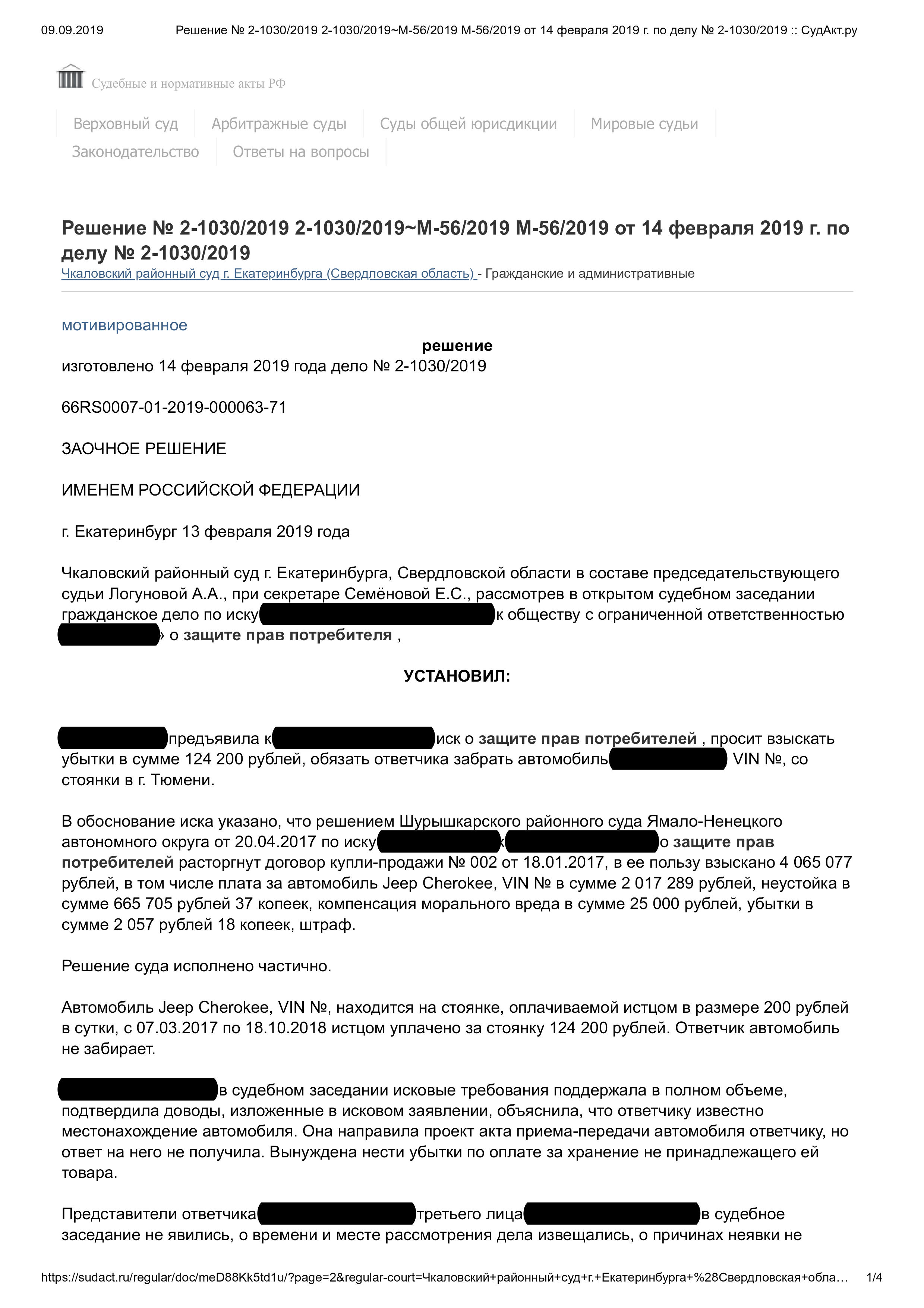 В результате рассмотрения дела исковые требования были удовлетворены: взысканы убытки, понесённые истцом по оплате услуг автостоянки, а также штраф за неудовлетворение требований потребителя в добровольном порядке. В том числе суд обязал ответчика забрать автомобиль с автостоянки.